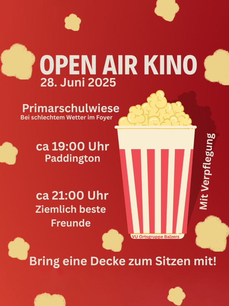 Am 29. Juni 2024 lud die VU-Ortsgruppe Balzers wieder zum beliebten Openair Kino ein. Ab 18.00 Uhr versammelten sich zahlreiche Besucherinnen und Besucher auf der Primarschulwiese – ausgestattet mit Decken und bester Laune. Aufgrund der unsicheren Wetterlage musste das Openair kurzerhand ins Foyer des Gemeindesaals verlegt werden. Doch die Stimmung blieb ungebrochen, und die Vorfreude auf einen geselligen Kinoabend war spürbar.