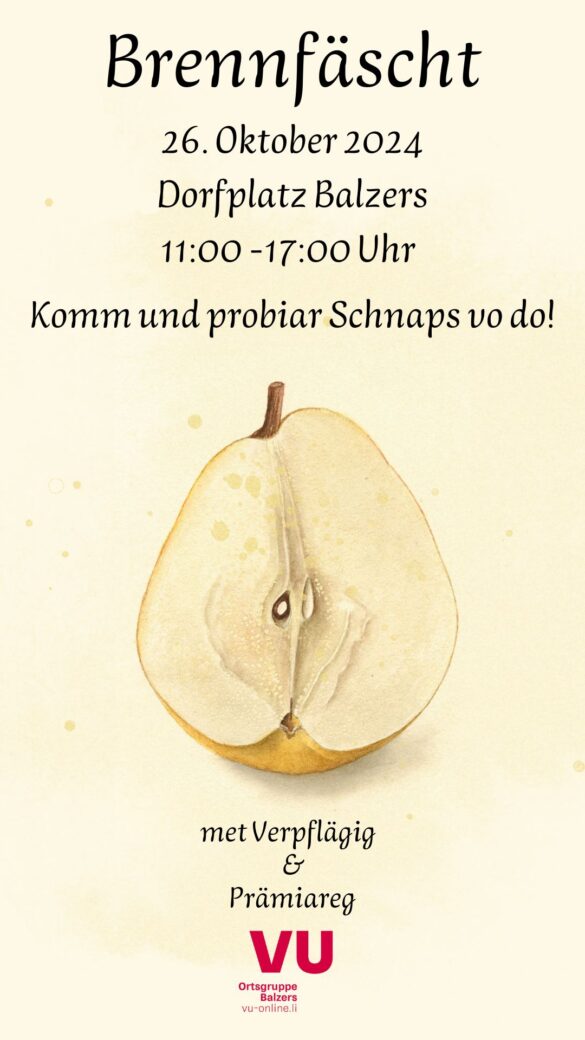 Am 26. Oktober 2024 fand das erste Brennfest der VU-Ortsgruppe Balzers auf dem Dorfplatz statt. Unter dem Motto „Komm und probiar Schnaps vo do!“ kamen einige Besucherinnen und Besucher zusammen, um sich über regionale Obstsorten und die Kunst des Schnapsbrennens zu informieren und natürlich auch zu verkosten.