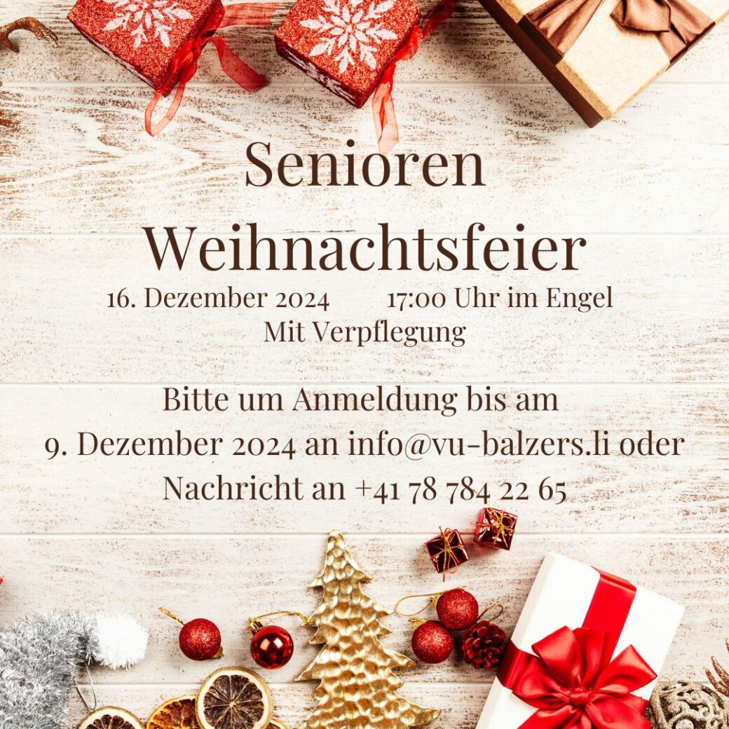 Am Montag, 16. Dezember 2024 lud die VU-Ortsgruppe Balzers ihre Seniorinnen und Senioren zur traditionellen Weihnachtsfeier ins Gasthaus zum Engel ein. Zahlreiche Gäste folgten der Einladung und genossen gemeinsam ein paar gemütliche, besinnliche Stunden in festlicher Atmosphäre.